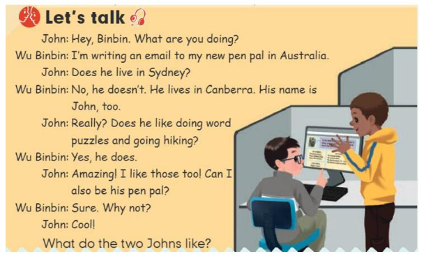 T:Yes. (出示插图)Look!Wu Binbin and John are taking about a pen pal,too.