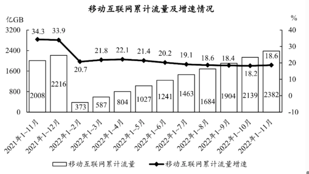 2022年1~11月移动互联网累计流量比2020年同期增长( )亿GB。
