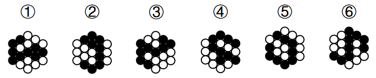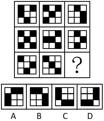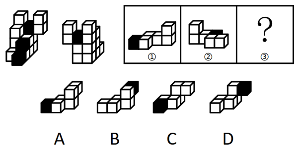 左图给定的是由等大的15个白色正方体和3个黑色正方体堆叠而成的多面体的正视图和后视图,该多面体可以由①、②和③三个多面体拼合而成,问以下哪一项能填入问号处?
