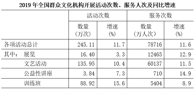 在2019年全国群众文化机构开展的各项活动中,平均每次活动服务人次数最多的是: