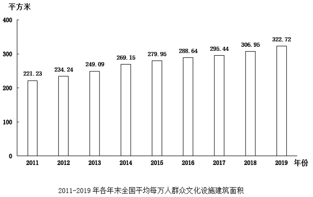 2019年末,全国群众文化机构实际使用房屋建筑面积4518.18万平方米,比上年末增长5.5%;业务用房面积3295.21万平方米,比上年末增长4.7%。年末全国平均每万人群众文化设施建筑面积322.72平方米,比上年末提高15.77平方米。