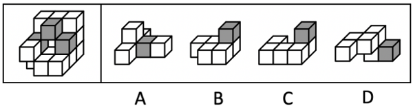 左下图为15个白色和3个灰色正方体组合而成的多面体,其可以由以下4项中除哪项外的3个小多面体组合而成?