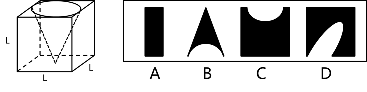 左图为给定的立体图形(边长为L),将其从任一位置剖开,则右边各项中不可能是该立体图形的截面形状的是( )。