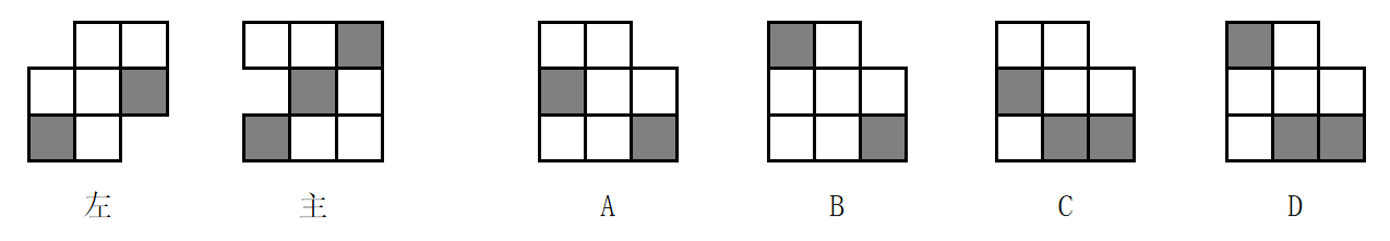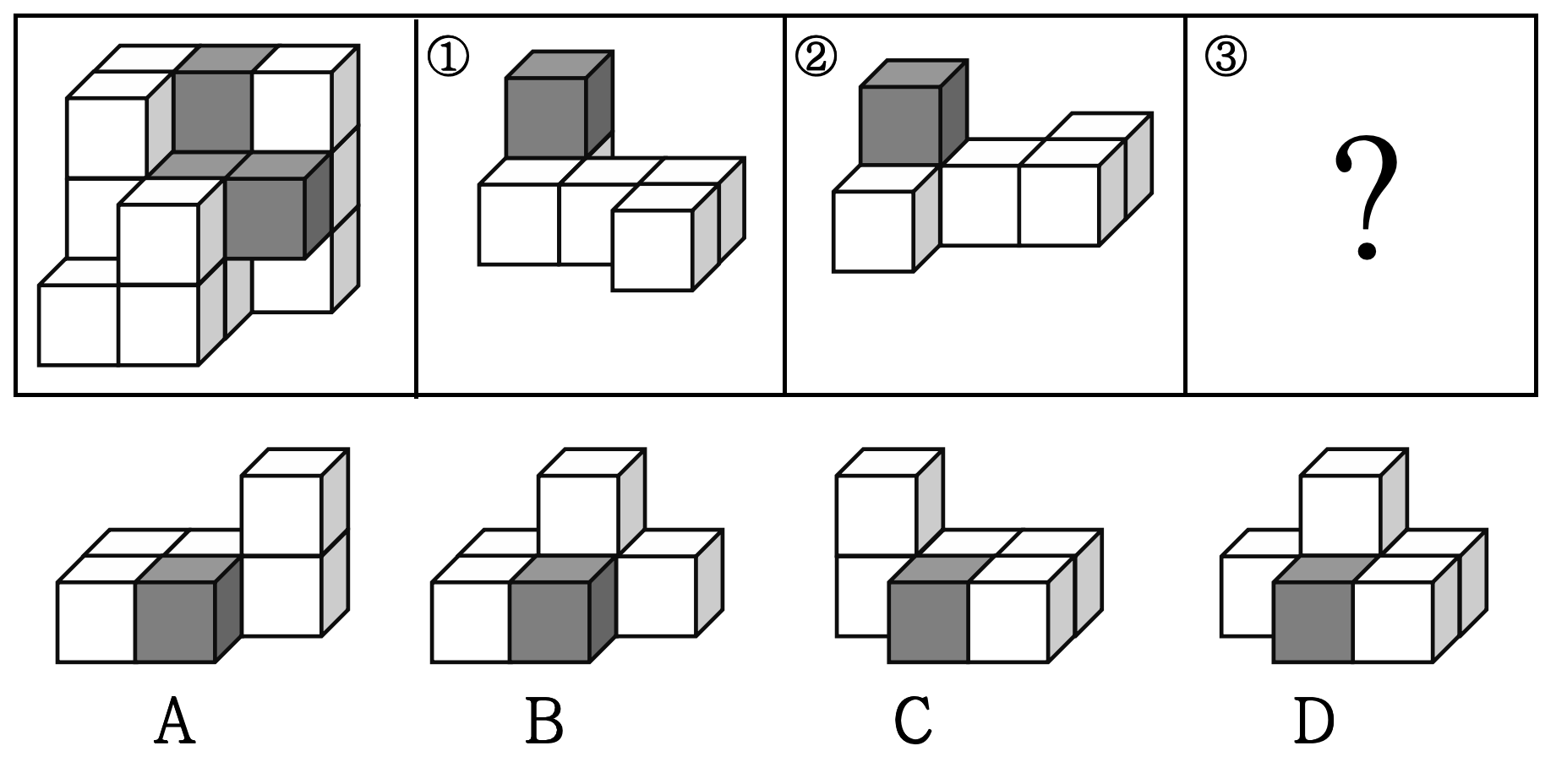 下图中,左边的多面体由相同大小的15个白色和3个灰色正方体组合而成,其可以折分为①、②和③,问以下哪项能填入问号处?( )