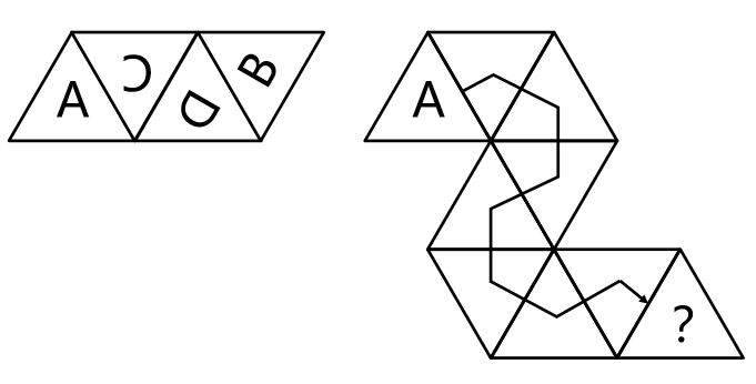 左图为给定正四面体的外表面展开图,将其折叠为正四面体后,把A面向下放在与右图完全一致的位置,然后沿箭头所示路径翻转正四面体到达问号处,问此时底面的字母为( )。