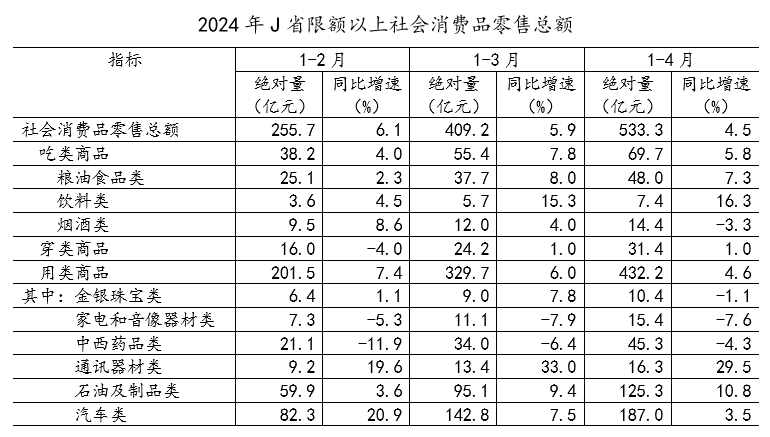 2024年1—4月,J省限额以上烟酒类商品零售总额占社会消费品零售总额的比重比上年同期( )。
