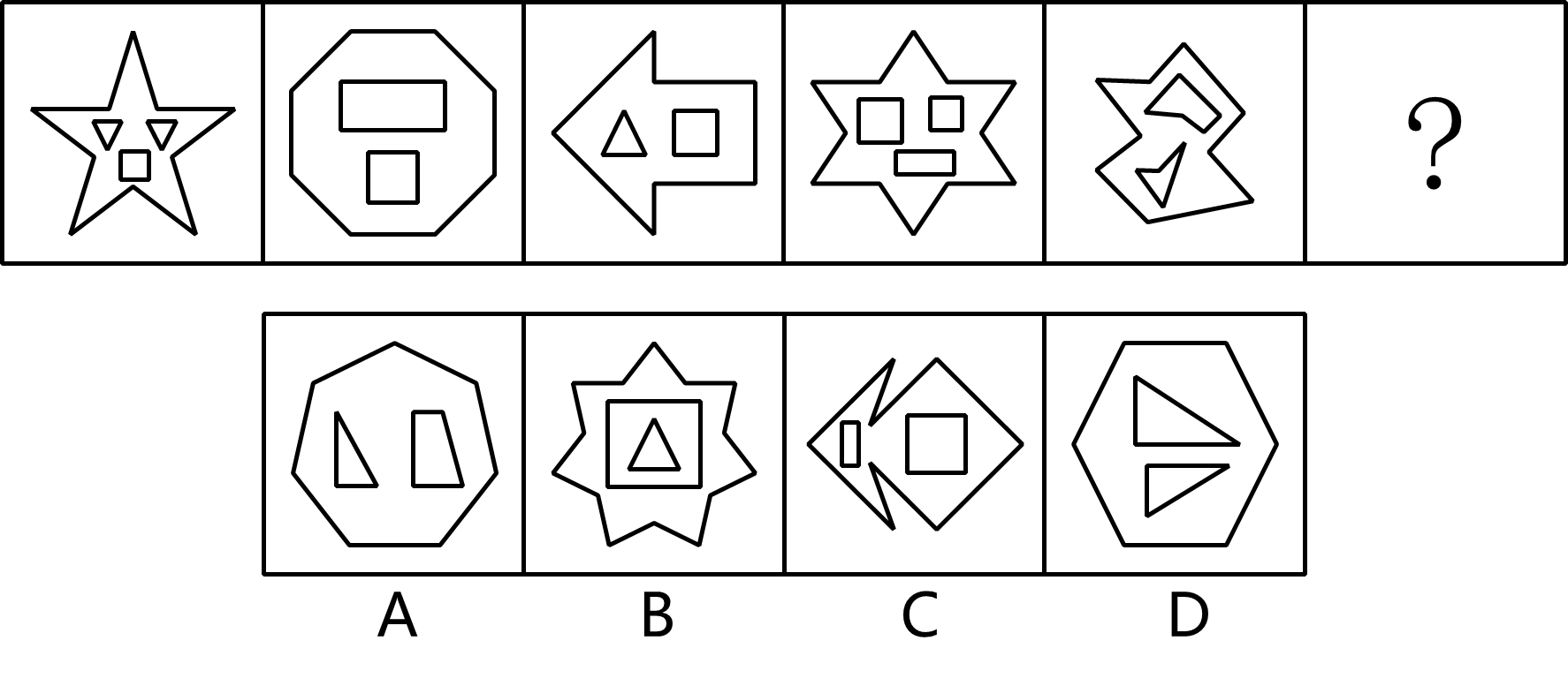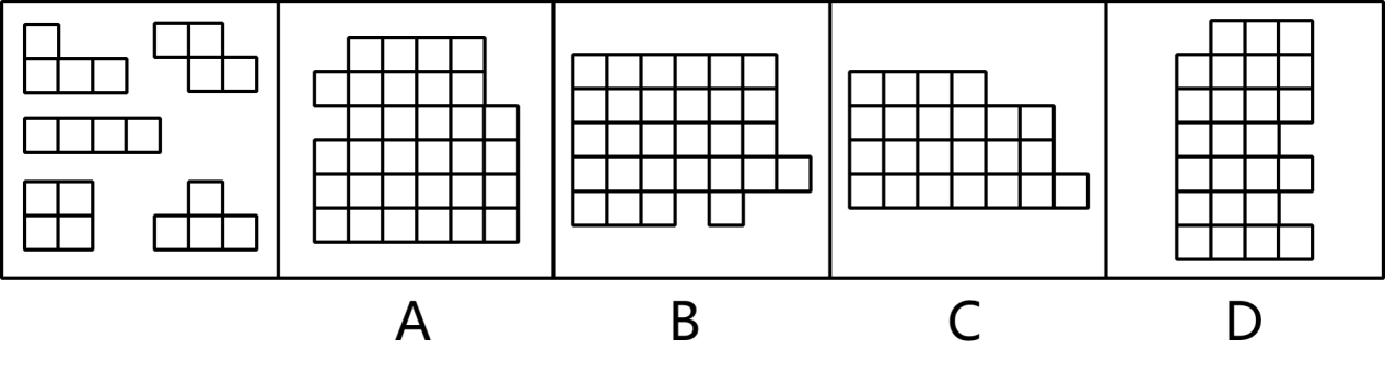 下面五个图形,可以拼合(可平移、旋转,不可翻转,每个图形至少使用一次)成选项中的哪一个图形?( )