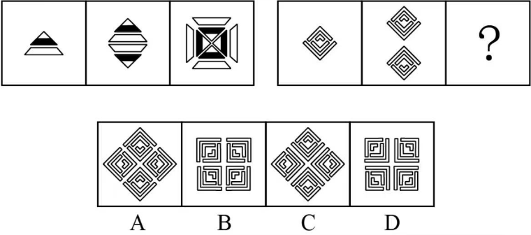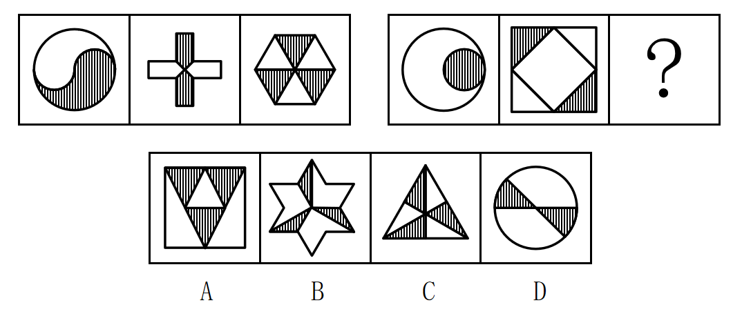 把下面的六个图形分为两类,使每一类图形都有各自的共同特征或规律,分类正确的一项是( )。