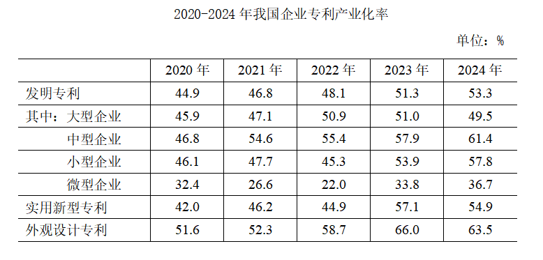 将我国企业的发明专利、实用新型专利、外观设计专利按产业化率从高到低排序,则2020~2023年中次序与2024年次序一致的年份有几个?