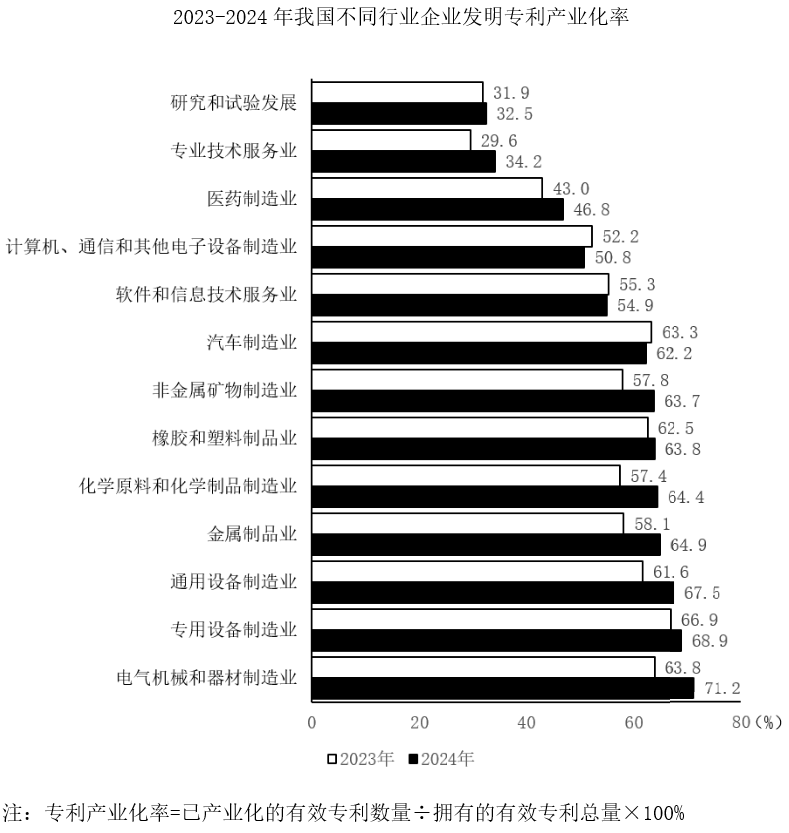 资料所列13个行业中,2024年企业发明专利产业化率同比增量超过3个百分点的有几个?