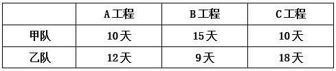甲、乙两个工程队单独完成A、B、C三个工程,所需时间如下: