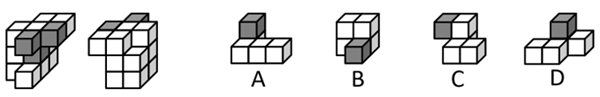 左边为由12个白色正方体和3个灰色正方体组合而成的多面体前后两面直观图,问其可以由除哪项外的三个多面体组合而成?