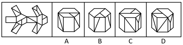 左边给定的是纸盒外表面的展开图,右边哪一项能由它折叠而成?