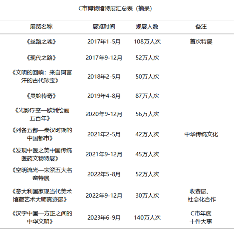 3.临时特展是一种由博物馆暂时性地组织资源并特别筹划的短期展示。C市博物馆着力塑造“辉煌历史”“多彩文明”“艺术典藏”三大临时特展系列,成为特色品牌之一,也是吸引游客多次前来参观的核心产品。自C市博物馆新馆开展以来,平均每年推出4-6个临时特展。以下是部分临时特展的资料: