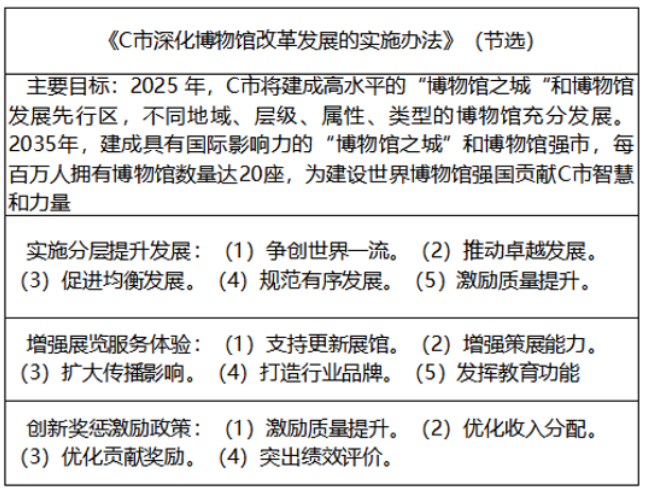2.解放和发展文化生产力,激发博物馆创新创造活力,是实现文博领域高质量发展的关键所在。C市市委市政府一向高度重视博物馆作为城市“名片”和“会客厅”作用,出台了《C市深化博物馆改革发展的实施办法》。