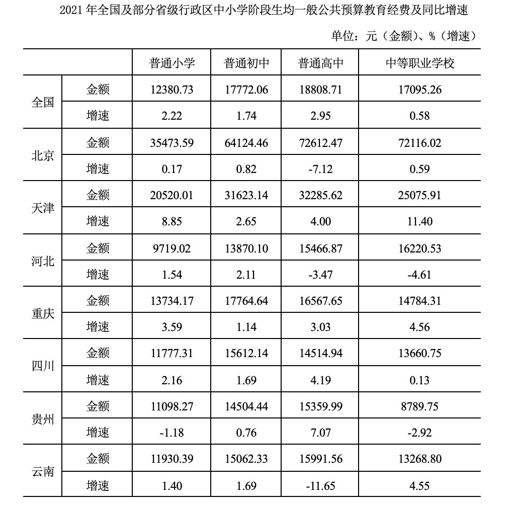 关于2021年表中7个省级行政区中小学阶段生均一般公共预算教育经费状况,能够从上述资料中推出的是( )。