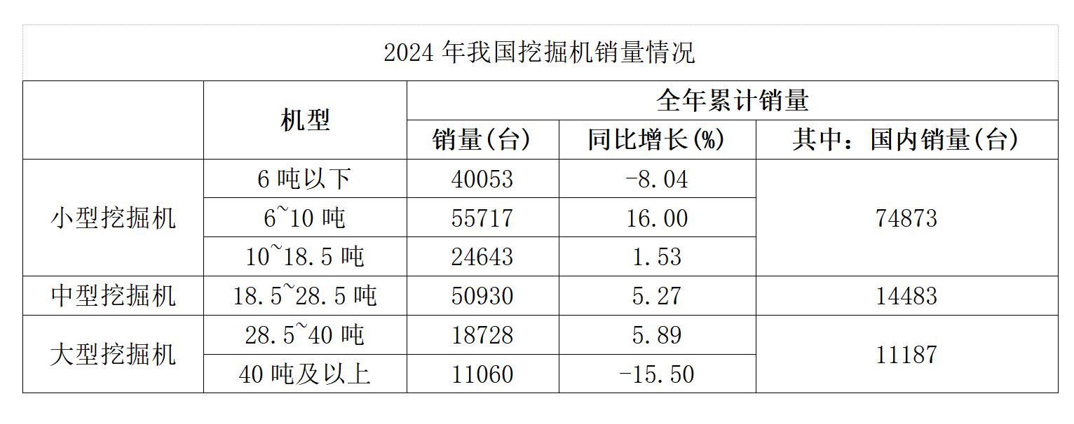 2024年上半年,我国挖掘机累计销量10.32万台,同比下降5.2%。其中国内销量5.34万台,同比增长4.7%。2024年全年,我国挖掘机累计销量20.11万台,同比增长3.1%。其中国内销量10.05万台,同比增长11.7%。
