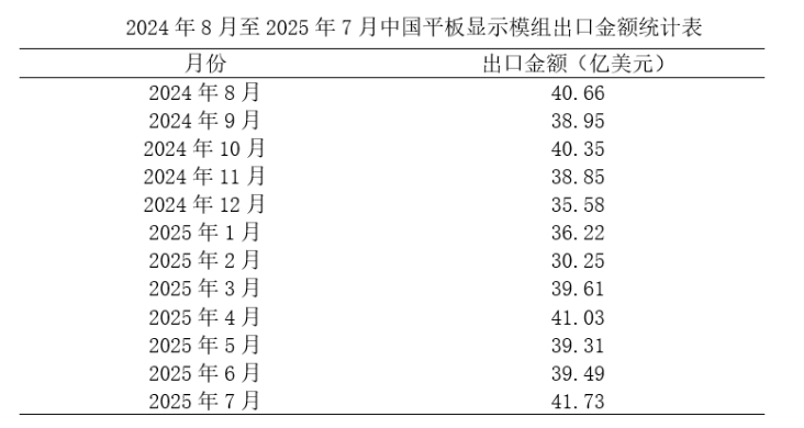 2025年7月中国平板显示模组进口数量为1.42亿个,同比下降9.2%;进口金额为29.52亿美元,同比下降11%。2025年7月中国平板显示模组出口数量为2.7亿个,同比增长19.5%;出口金额为41.73亿美元,同比下降1.7%。