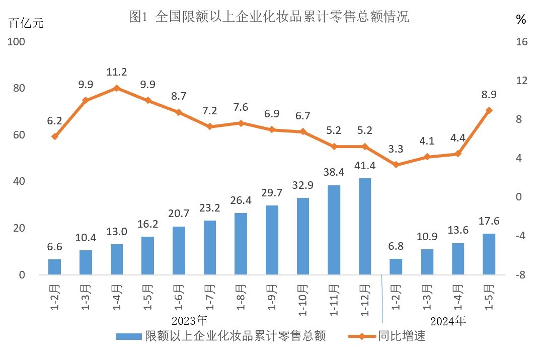2024年1—5月全国限额以上企业化妆品累计零售总额较2022年同期( )。