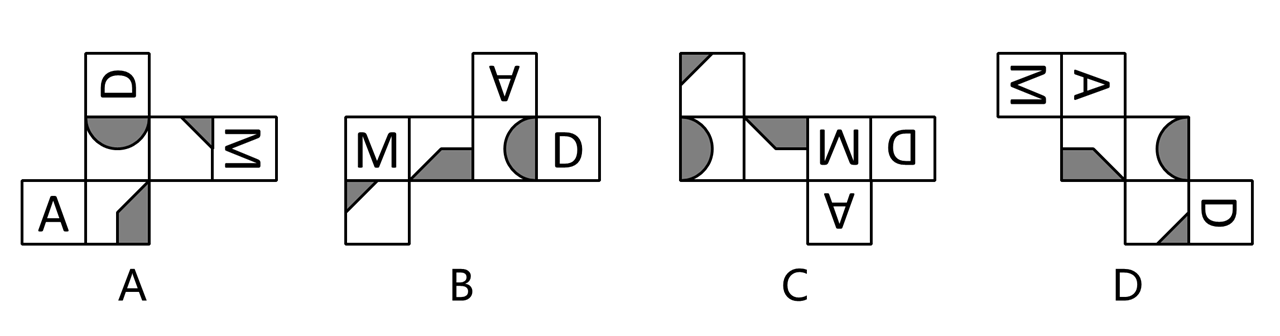 以下为4个正方体纸盒的外表面展开图,问哪一个折叠成的纸盒和其他3个不一样?( )