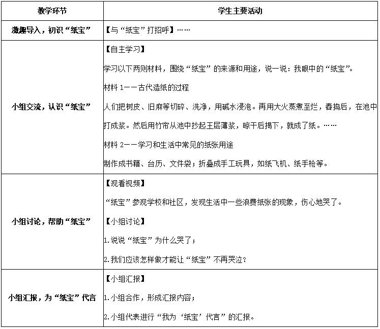 二年级下册《道德与法治》第三单元的主题是“绿色小卫士”,共4课时。《我是一张纸》是其中一课,吴老师将这节课的教学过程设计成4个环节,如下表所示: