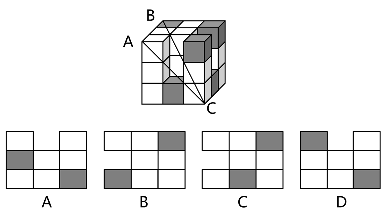 以下为5个灰色和18个白色正方体堆积而成的立体图形,将其经A、B、C三个顶点切开后,哪一个是其正确的截面?( )