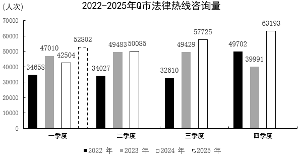 以下折线图中,最能准确反映2022-2025年间Q市法律热线咨询量第二季度环比增量变化趋势的是: