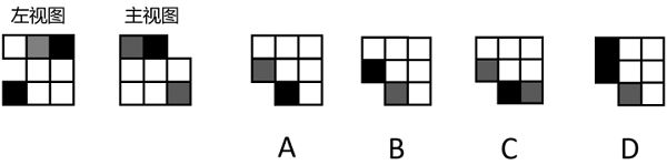 左下图为14个白色、2个灰色和2个黑色正方体组成的多面体的左视图和主视图,问哪一项可能是其正确的俯视图?