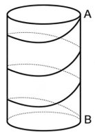 为庆祝春节,某村计划在村口的两根圆柱体石柱上缠绕灯带。每根石柱需绕上3圈灯带,起始点为A,终点为B,如下图所示。若每根石柱高为5米,横截面圆的周长为4米,那么两根石柱所需的灯带总长度最短为多少米?