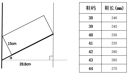 小刚新做了一个鞋柜,鞋柜的纵截面如左下图所示。鞋柜水平深度28.8厘米,隔板与水平面夹角为,这个格子刚好放得下一个15厘米高的鞋盒,则这双鞋的鞋码最大是:(参考数据: