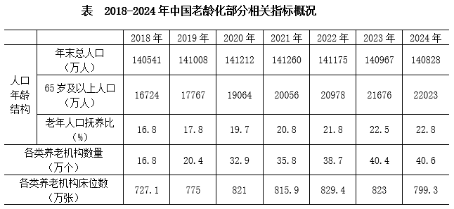 截至2024年末,我国60岁及以上人口突破3亿,达到31031万人。养老服务相关企业约16万家,比2023年底增长24.36%。全国共有各类养老机构和设施40.6万个,养老床位合计799.3万张。其中,注册登记的养老机构4.0万个,比上年下降1.2%,床位507.7万张(护理型床位占比为65.7%),社区养老服务机构和设施36.6万个,床位291.5万张。