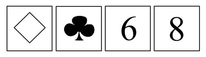 以上4张卡片均为一面是图案,另一面是阿拉伯数字。现在断定:如果一面是梅花,那么另一面是6。